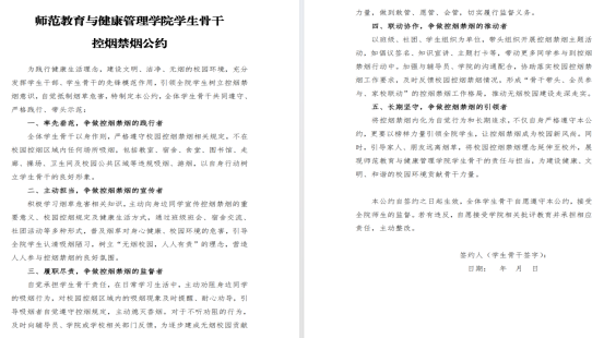学生骨干们系统学习校园控烟禁烟管理规定,详细解读《师范教育与健康管理学院学生骨干控烟禁烟公约践行工作通知》,明确公约践行要求、监督考核办法及学生骨干的五大核心职责,让控烟禁烟的制度要求入脑入心。